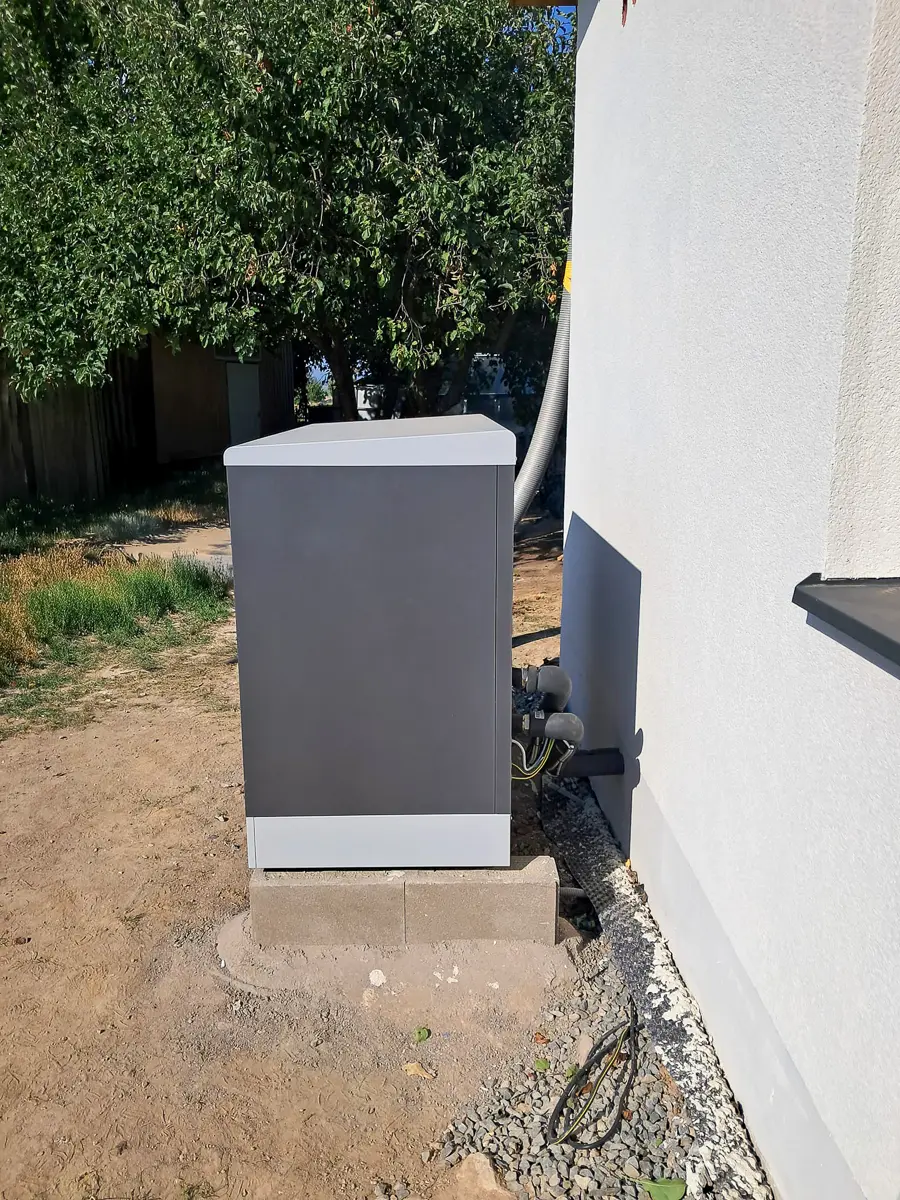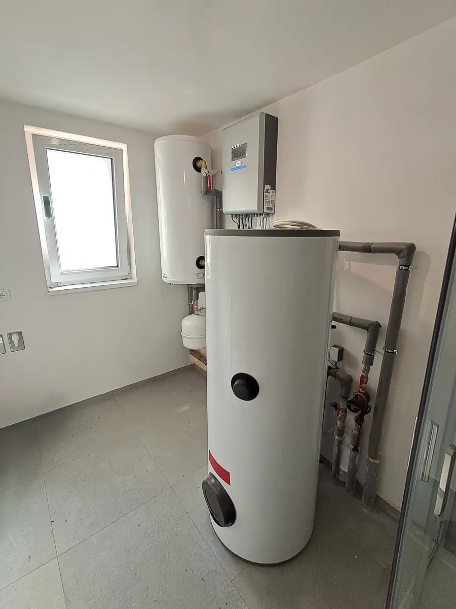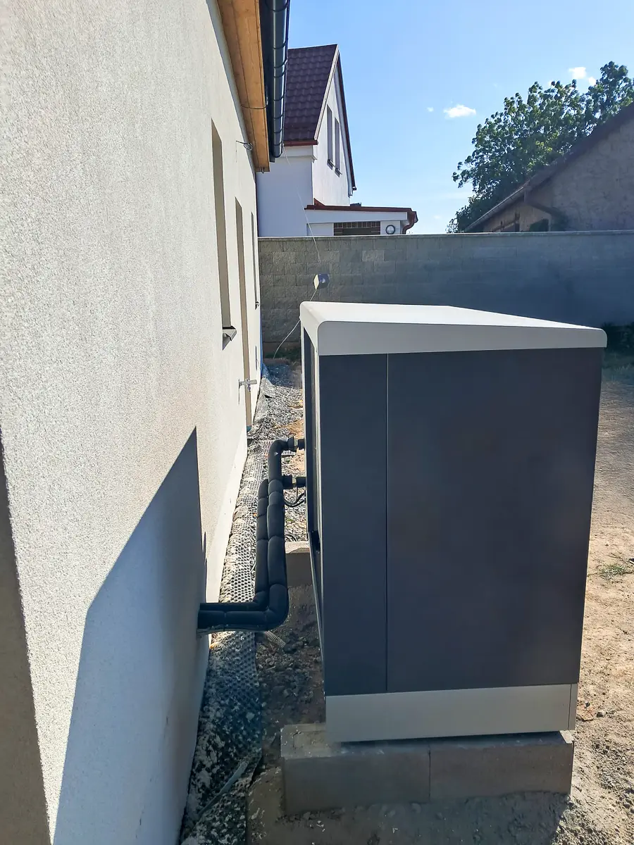 Systém typu vzduch–voda je doplněn o akumulační nádobu 250 l, zásobník TUV 200 l a záložní elektrokotel 6 kW.