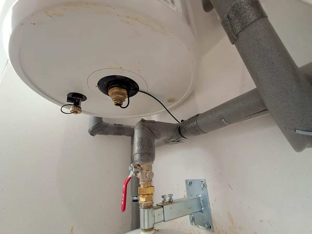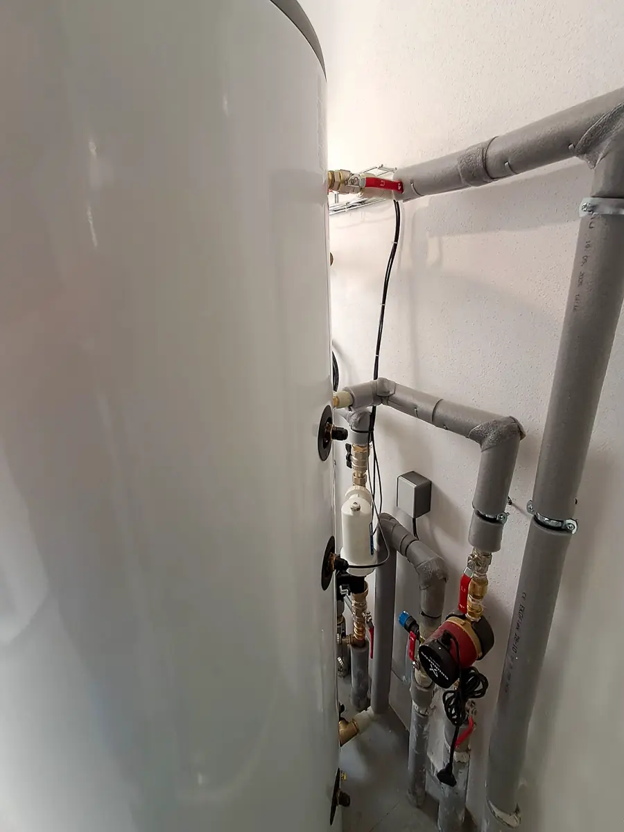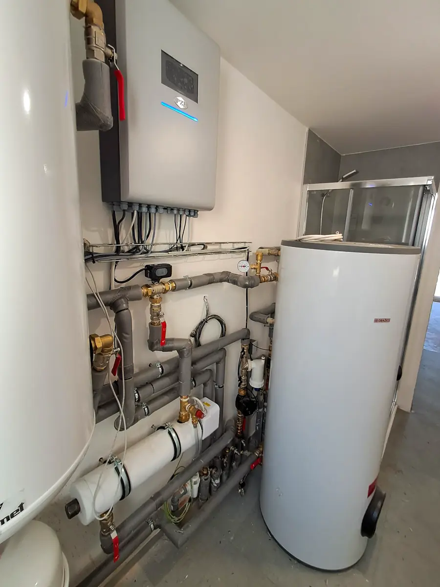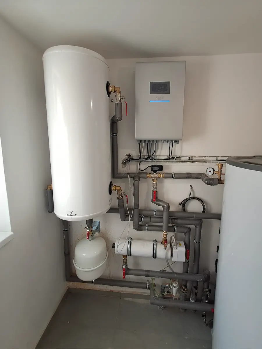 Systém typu vzduch–voda je doplněn o akumulační nádobu 250 l, zásobník TUV 200 l a záložní elektrokotel 6 kW.