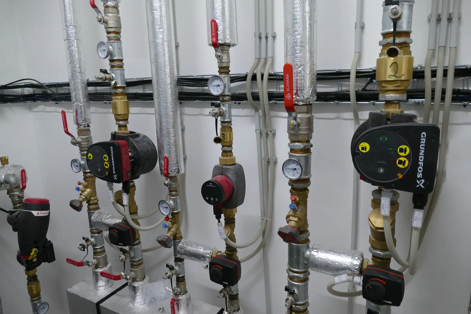 Otopná soustava je tvořena čtyřmi samostatnými okruhy, které řídí regulace TČ. Topné větve jsou vybaveny čerpadlovou sestavou, trojcestným regulačním ventilem pro ekvitermní regulaci topné vody v závislosti na venkovní teplotě. Před zdroje tepla jsou osazeny magnetické filtry s odlučovačem nečistot.